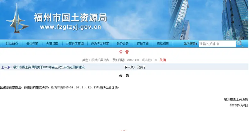 [摘要] 因规划调整原因,经市政府研究决定,取消宗地2015-09、10、11、12、13号地块出让活动。