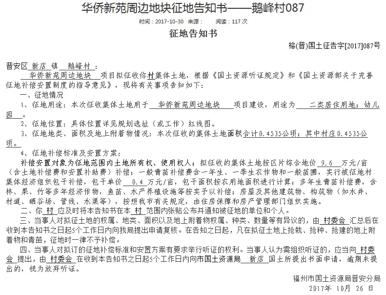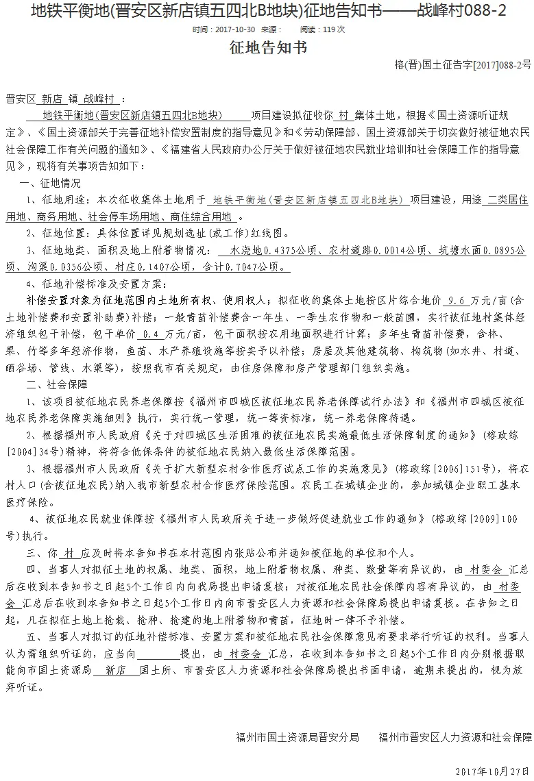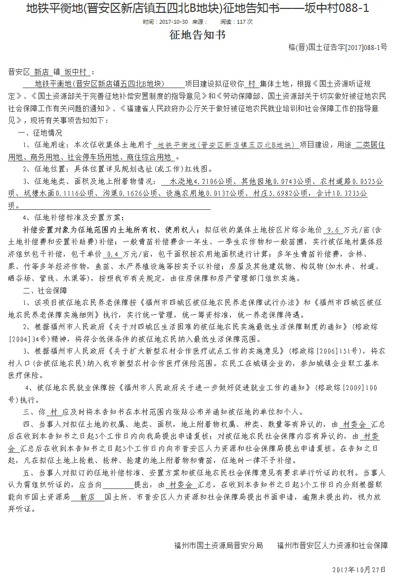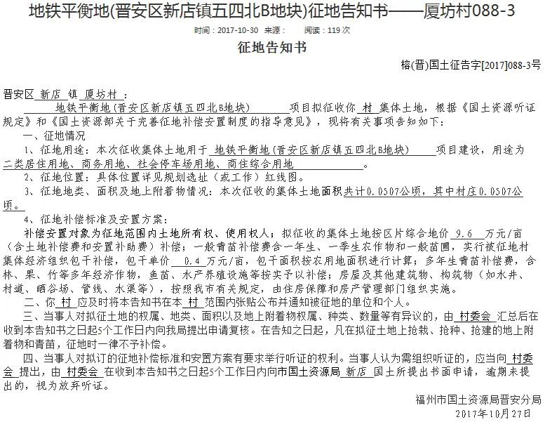 住在福州2017-10-31 10:32:0010月30日,福州国土资源局公布了征地与安置补偿,全部是晋安新店镇的征地告知书,涉及四个村,分别是厦坊村、战峰村、坂中村、鹅峰村,征地用途多样,包括:二类居住用地、商务用地、社会停车场用地、商住综合用地、幼儿园。全是惠及周边群众的福利配套!
